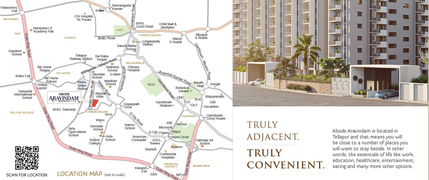 Located in the first lane of Tellapur, Abode Aravindam offers excellent connectivity with easy access to IT hubs, shopping malls, educational institutions, and entertainment spots.