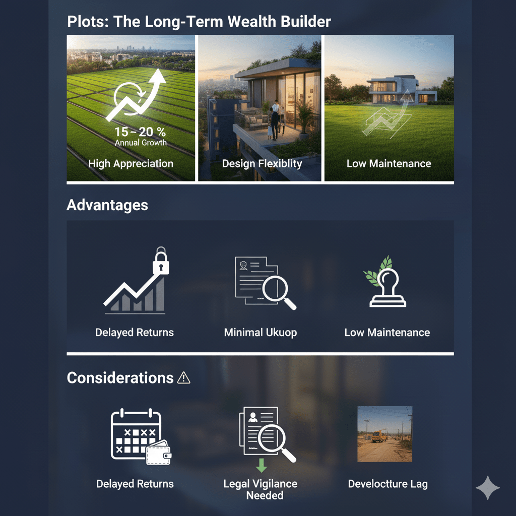 Plots, on the other hand, are for investors playing the long game — those who want flexibility, capital appreciation, and lower recurring costs.