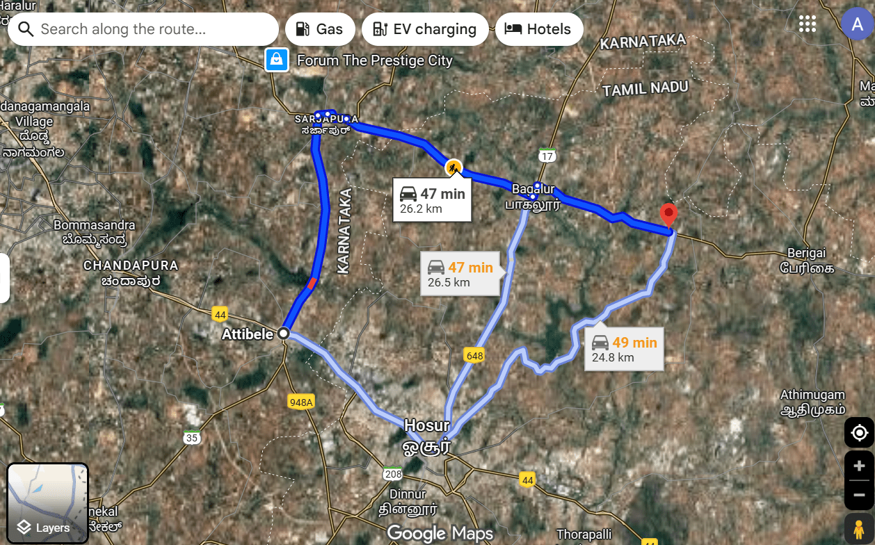 For those unfamiliar, the area lies northeast of Hosur town and sits right along the planned Bengaluru Satellite Town Ring Road (STRR). That means easy connectivity to Bengaluru’s tech corridors — Whitefield, Sarjapur, and Electronic City — without the nightmare of driving all the way to Kempegowda International Airport in Devanahalli.