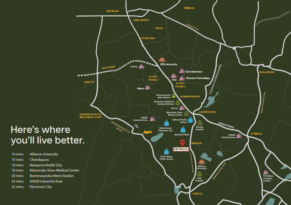 Oxyrich’s location next to Surya City Phase 2, Marsur, offers the rare balance between connectivity and greenery.