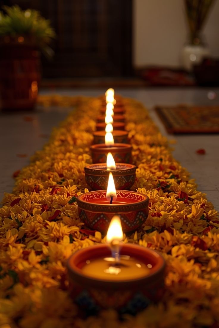 Use earthen lamps; they balance the earth element, and always light them in odd numbers (1, 3, 5, 7) for harmony.