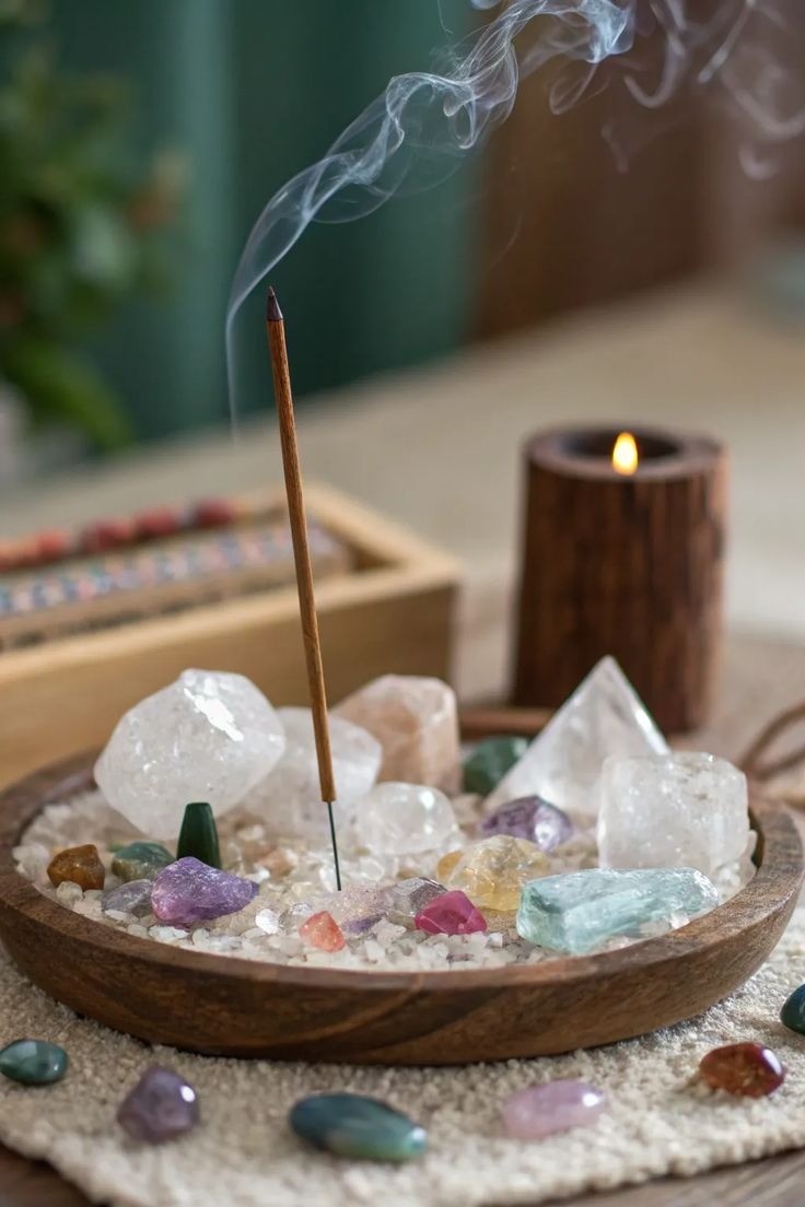 Cleanse stones in salt water and charge them in sunlight before use. Add sacred items like Shankha (conch) in the North-East, cowrie shells in a silver bowl, and lotus flowers near your altar, all classic symbols of abundance.